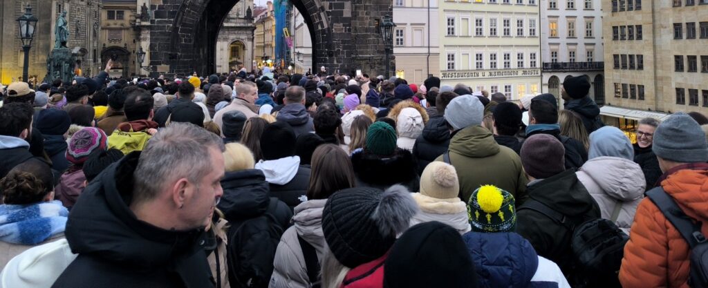 Il Ponte Carlo è sempre pieno di gente. Quando accendono le luci, che sono a led e non lanterne vere e proprie, è decisamente sconsigliato esserci se si soffre la ressa.